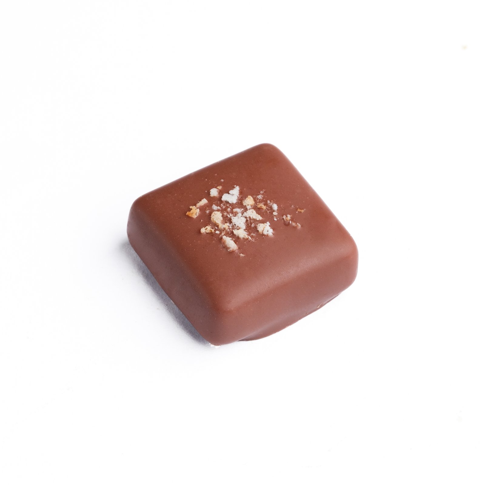 Coquille très fine en Chocolat Lait avec une ganache de crème mousseline à la noisette, petits éclats d’amandes